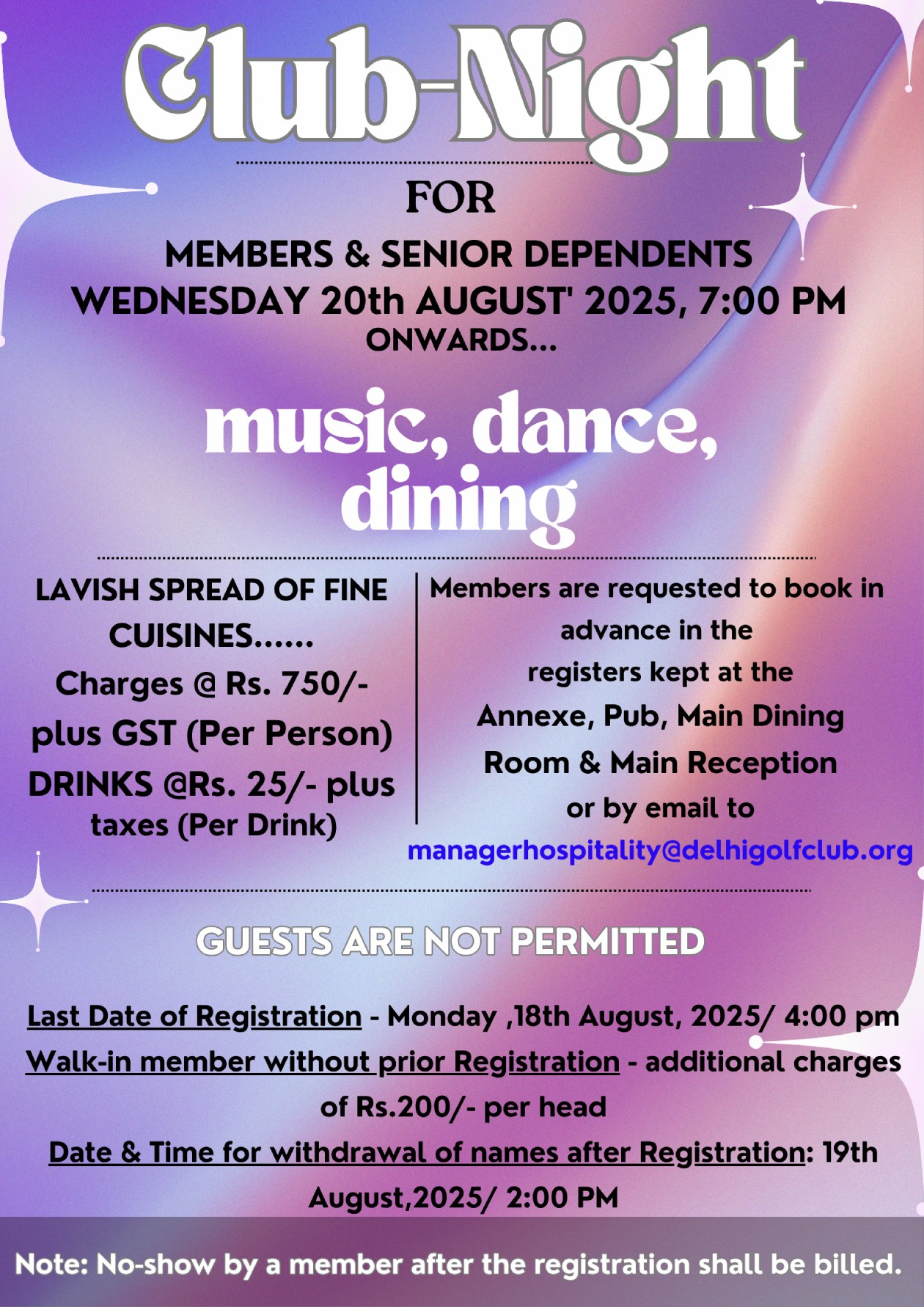 Members are requested to book in advance in the registers kept at the Annexe, Pub, Main Dining Room & Main Reception or by email to managerhospitality@delhigolfclub.org.